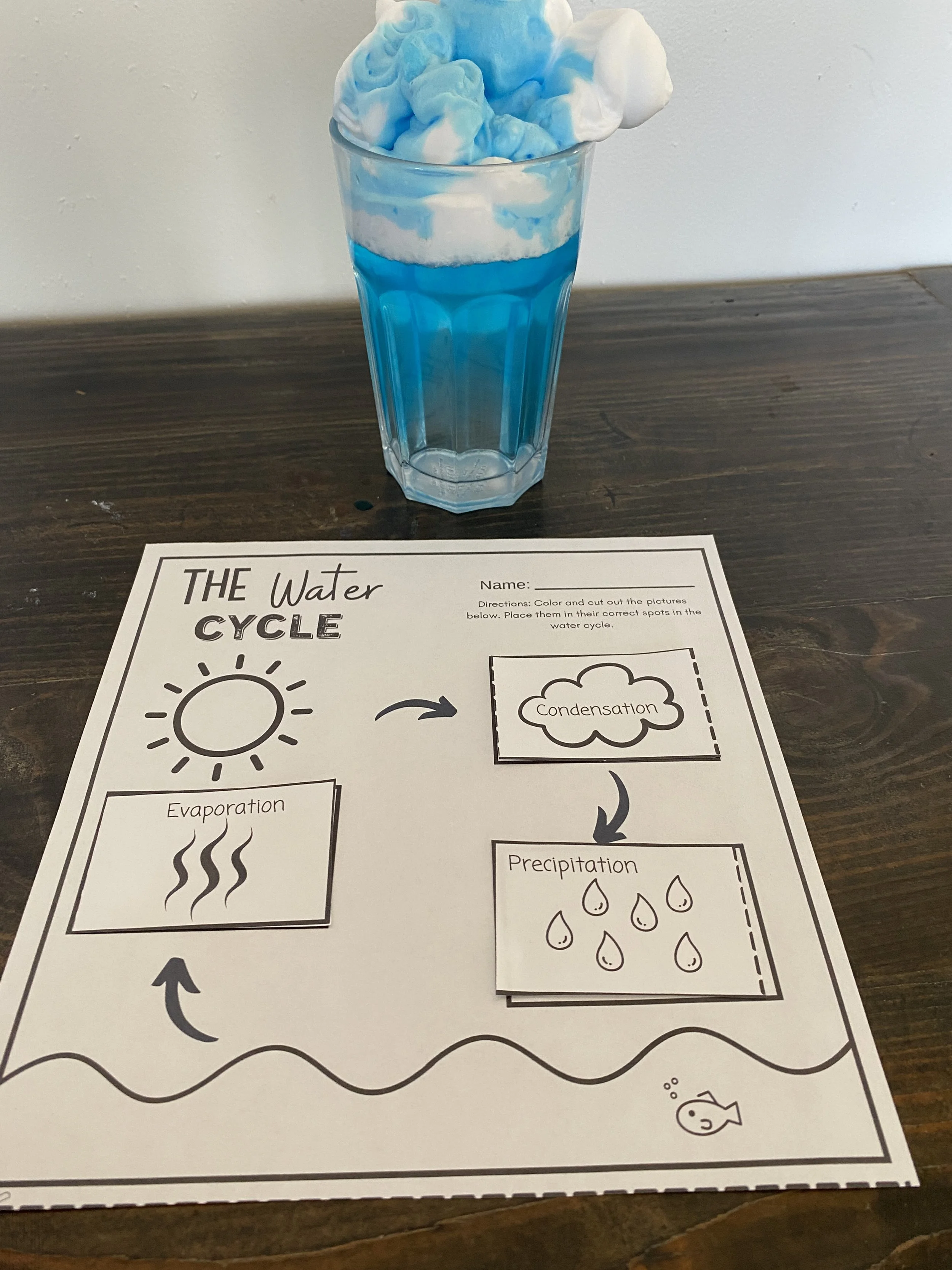 Together, fill out the recording sheet to show what happened. Then you can do the water cycle cut and paste page for even more learning!