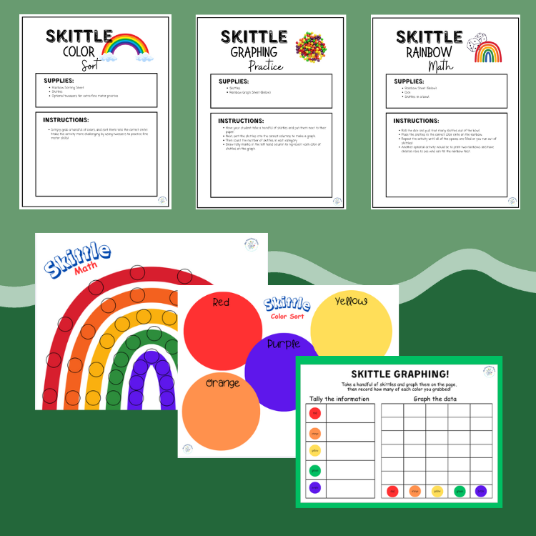 Try these fun and easy Skittle math activities for St. Patrick's Day! They are perfect for preschoolers and kindergarteners. You can use them in the classroom or at home! They are digital downloads so all you need to do is download and print and you're ready for math fun!